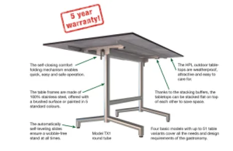 TREWA GmbH supplies top-quality tables designed for heavy-duty, professional use in the catering, hospitality and care sectors, for both indoor and outdoor use. These tables demonstrate that outstanding technical innovation can be combined with a highly attractive design.